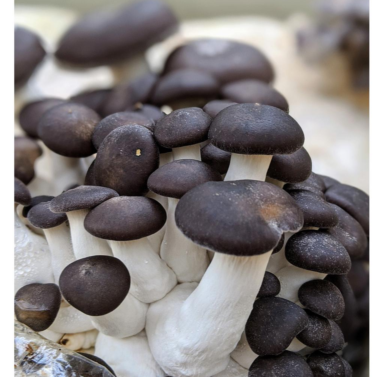 These mushrooms debut with the shape of a King Oyster but gradually flatten into broad caps showing a marbled or deep black hue reminiscent of pearls—hence the name “Black Pearl” . The clusters showcase thick, meaty stems supporting darker, suede-like caps.